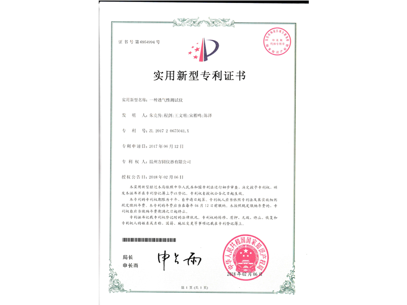 中國實用新型專利:一種透氣性測試儀(ZL 2017 2 0675041.X)