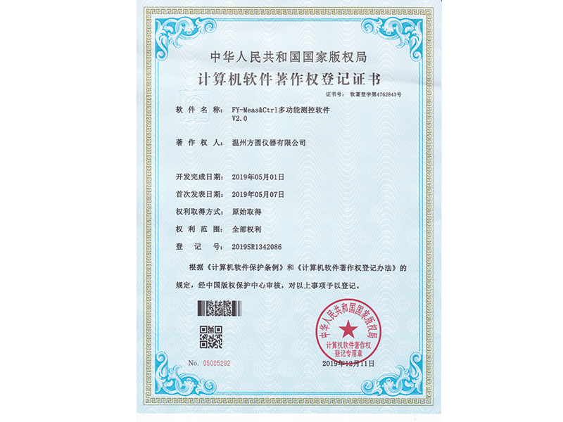 中華人民共和國國家版權(quán)局 計算機軟件著作權(quán)登記證書:FY-Meas&Ctrl多功能測控軟件V2.0(軟著登字第4762843號)